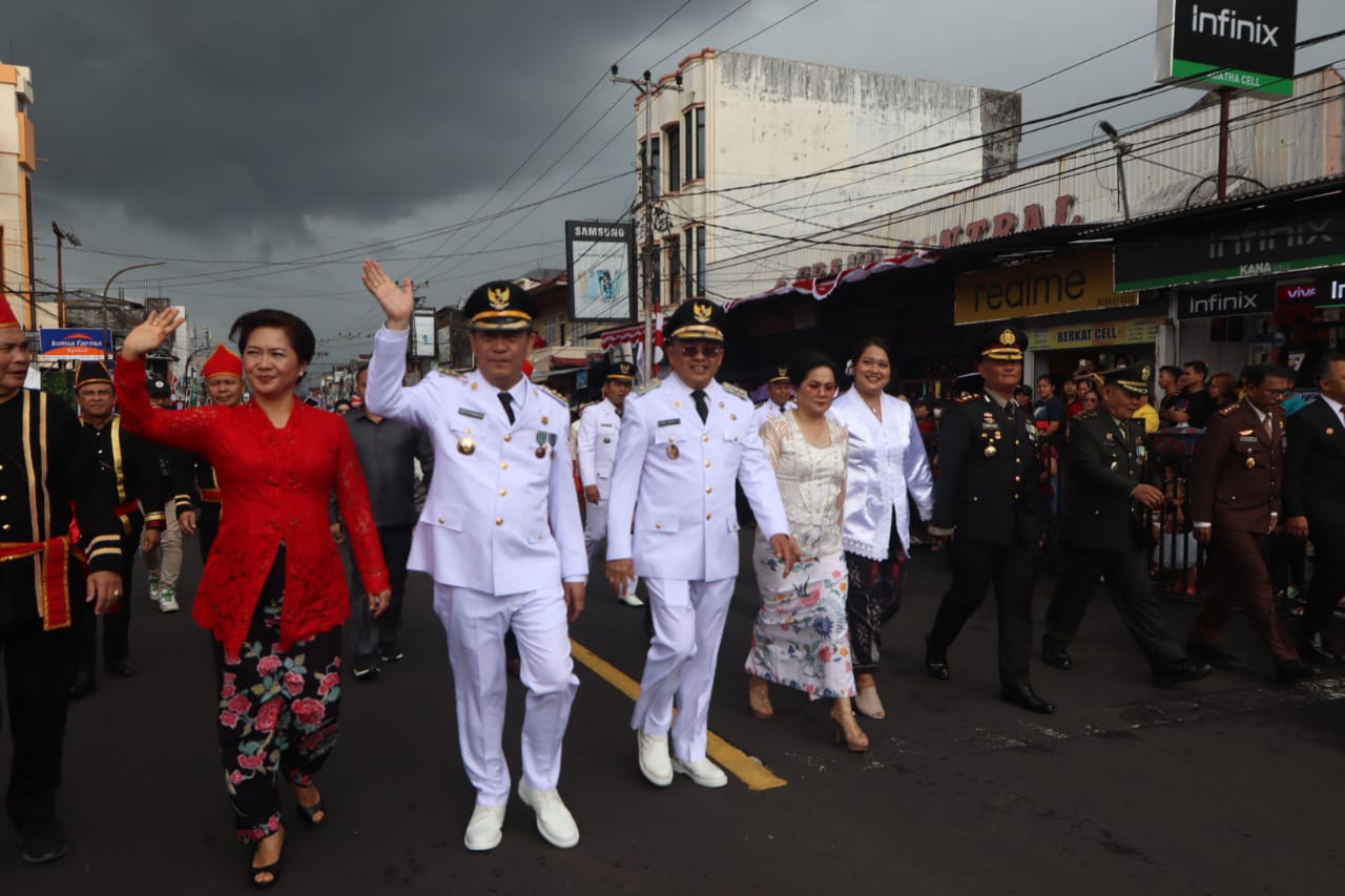 Tomohon,Ekuatornews.com- Walikota Tomohon bersama Ketua TP-PKK Kota Tomohon dan Wakil Walikota Tomohon bersama Sekretaris TP-PKK Kota Tomohon menyaksikan secara langsung di panggung kehormatan di kompleks Menara Alfa Omega kota Tomohon defile pawai dalam rangka HUT Kemerdekaan Ke- 78 Republik Indonesia.