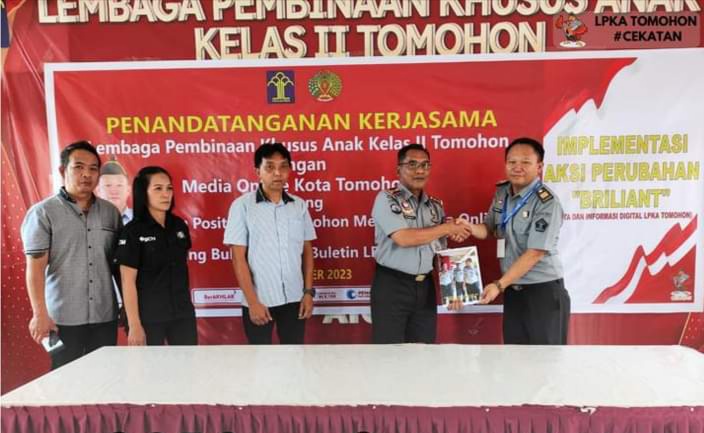 Tomohon,Ekuatornews.com- Lembaga Pembinaan Khusus Anak (LPKA) Kelas II Tomohon menggelar Penandatanganan Perjanjian Kerja Sama dengan Media Online Tomohon tentang Pemberitaan Positif LPKA Tomohon melalui Media Online dan Launching Buletin dan E-Buletin. Bertempat di Aula LPKA Tomohon. Senin 6 /11/2023.