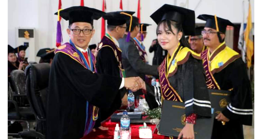 Rektor Unsrat Oktovian Sompie mengucapkan selamat kepada seluruh mahasiswa yang pada hari ini merayakan momen kesuksesan ini.