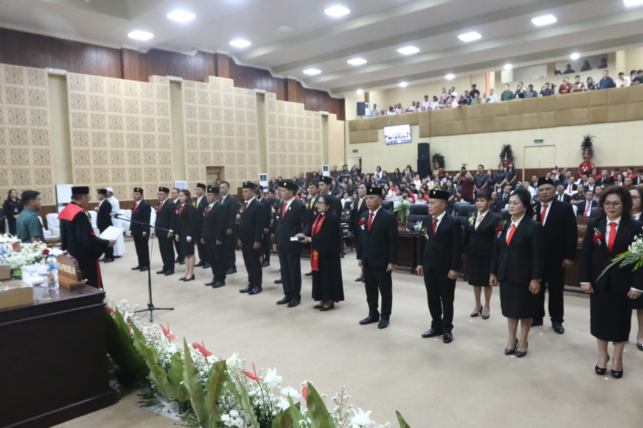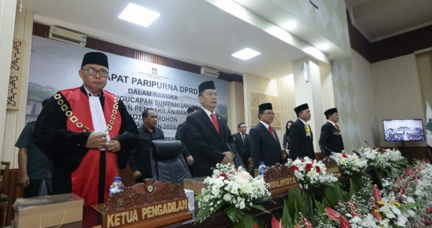 Tomohon,Ekuatornews.com – Walikota Tomohon, Caroll J.A. Senduk, SH, didampingi oleh Ketua TP PKK Kota Tomohon, Drg. Jean D’Arc Senduk-Karundeng, menghadiri Rapat Paripurna Pengucapan Sumpah/Janji Anggota DPRD Kota Tomohon hasil Pemilihan Umum Tahun 2024. Acara yang dilaksanakan pada Selasa (17/9/2024) bertempat di Ruang Sidang DPRD Kota Tomohon, berlangsung dengan khidmat dan dihadiri oleh berbagai tokoh penting daerah.