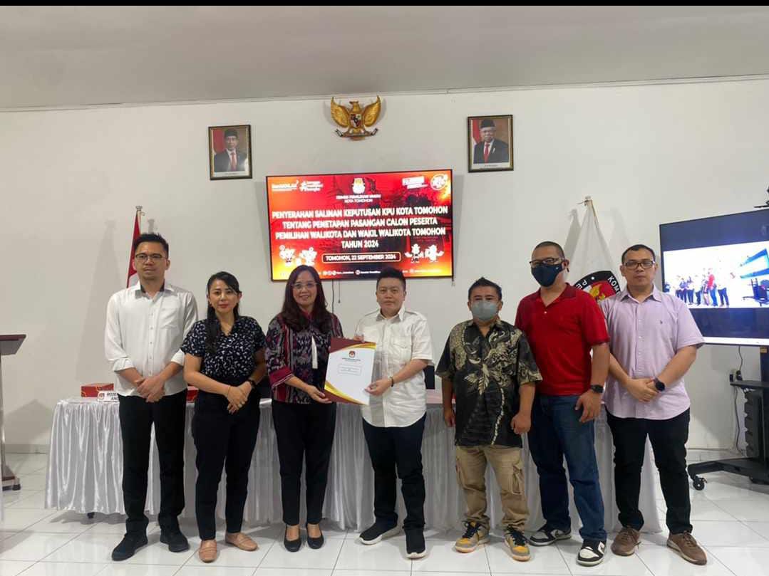 Penetapan ini dilakukan dalam acara, Penyerahan Salinan Keputusan KPU Kota Tomohon tentang Penetapan Pasangan Calon Peserta Pemilihan Walikota dan Wakil Walikota Tomohon Tahun 2024, yang diselenggarakan di Ruang Rapat KPU Kota Tomohon, Minggu (22/9/2024). Pada acara ini, salinan keputusan diserahkan kepada perwakilan pasangan calon serta Badan Pengawas Pemilu (Bawaslu) Kota Tomohon.