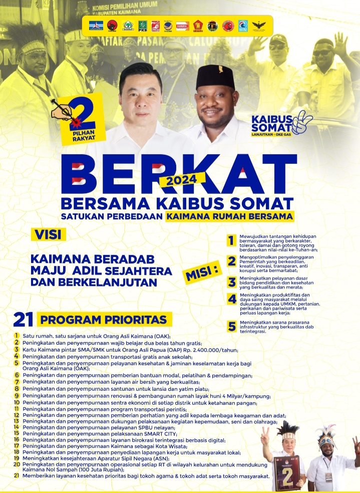 Diketahui, BERKAT adalah jargon dari pasangan calon (Paslon) Bupati Kaimana Freddy Thie dan Wakil Bupati Sobar Somat Puarada.