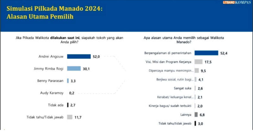 Selain itu, dari hasil survei Litbang Kompas itu menyebutkan, sosok Andrei Angouw meraih 52% sebagai tokoh yang akan dipilih.