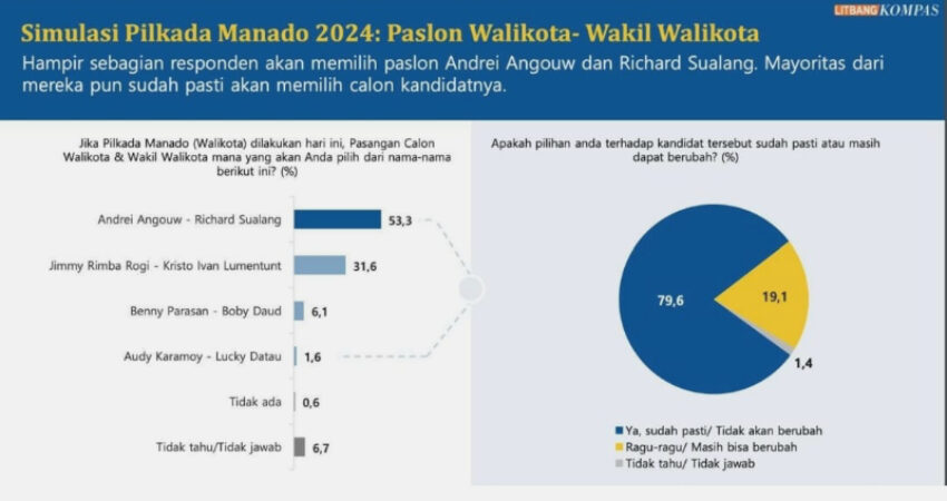 Manado, EkuatorNews.com – Hasil survei Litbang Kompas terbaru menempatkan pasangan calon Andrei Angouw-Richard Sualang (AARS) mengungguli 3 paslon lainnya dalam Pilkada Manado 2024.