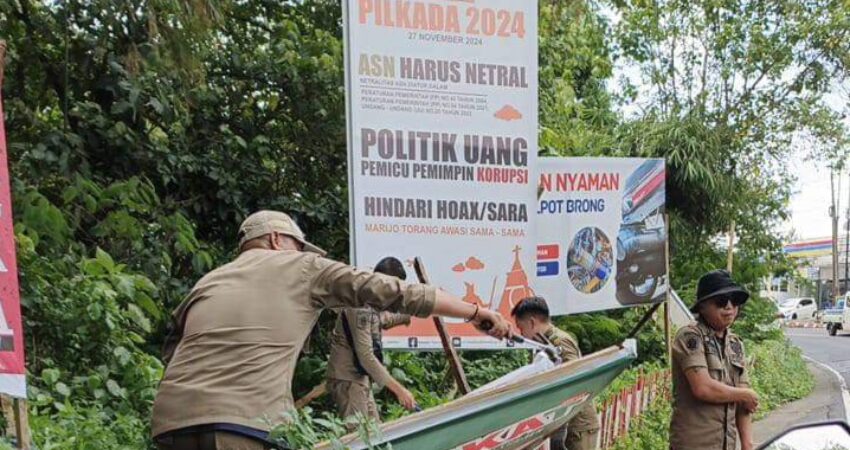 “Kami menertibkan baliho yang melanggar aturan, baik dari segi konten yang tidak sesuai ketentuan maupun penempatannya di lokasi-lokasi yang seharusnya steril dari APK. Kami menghimbau kepada seluruh pihak agar tidak mengulangi pelanggaran yang sama di kemudian hari,” tegas Kowaas.