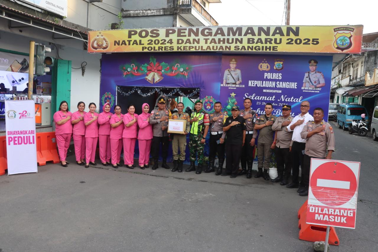 Sangihe – Ekuatornews.com.- Kapolres Kepulauan Sangihe, AKBP Abdul Kholik, S.H., S.I.K., M.A.P., bersama dengan Ketua Bhayangkari Cabang Kepulauan Sangihe, Ny. Adellia Kholik, melaksanakan penyerahan bantuan Bhayangkari Peduli untuk petugas yang bertugas di pos pengamanan Natal dan Tahun Baru pada hari Senin (30/12/2024) bertempat di Kota Tahuna, Wilayah Hukum Polres Kepulauan Sangihe.