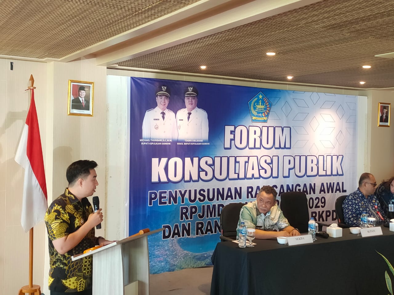 Sangihe – Ekuatornews.com.- Bupati Kepulauan Sangihe Michael Thungari.SE,MM didampingi Sekertaris Daerah dan Kepala Balitbang membuka secara resmi Forum Konsultasi Publik Penyusunan Rajangan Awal Rencana Pembangunan Jangka Menengah Daerah (RPJMD) tahun 2025-2029.bertempat di Tahuna Beach Hotel, Jumat (7/3/2025)