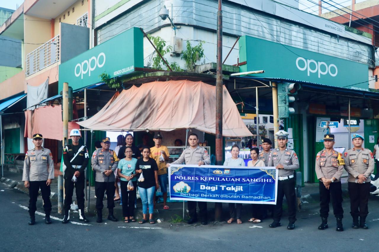 Sangihe Ekuatornews.com.- Kapolres Kepulauan Sangihe, AKBP Abdul Kholik, S.H., S.I.K., M.A.P., bersama jajaran pejabat utama (PJU) Polres Kepl. Sangihe melaksanakan kegiatan berbagi takjil dan silaturahmi dengan masyarakat Kota Tahuna pada Rabu, 26 Maret 2025. Kegiatan yang berlangsung sejak pukul 17.31 WITA ini bertujuan untuk mempererat hubungan antara kepolisian dan masyarakat, khususnya dalam momentum bulan suci Ramadan. Kegiatan ini juga menjadi wujud kepedulian Polres Kepl. Sangihe terhadap warga yang tengah menjalankan ibadah puasa.