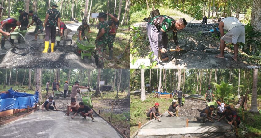 Dengan cuaca yang cerah dan cukup hangat, warga dan anggota Tim Satgas TMMD masih semangat dan tidak menyurutkan semangat para Prajurit dan warga setempat mereka bergotong-royong mengerjakan pengecoran jalan bersama-sama.