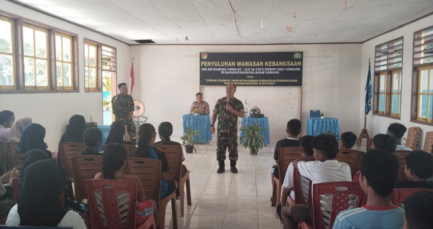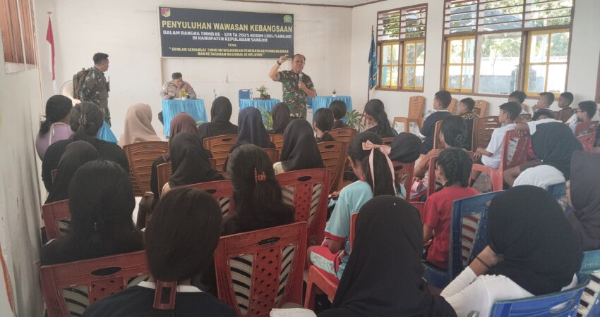 Sangihe – Ekuatornews.com.- Program TNI Manunggal Membangun Desa (TMMD) ke-124 yang diselenggarakan oleh Kodim 1301/Sangihe tidak hanya berfokus pada pembangunan fisik infrastruktur di wilayah terpencil, tetapi juga turut memberikan kontribusi dalam pembangunan non-fisik, salah satunya melalui edukasi wawasan kebangsaan. Kegiatan ini bertujuan untuk menanamkan nilai-nilai cinta tanah air, semangat persatuan, serta kesadaran bela negara kepada generasi muda.