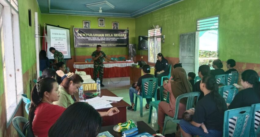 Sangihe – Ekuatornews.com – Sebagai bagian dari sasaran non-fisik TNI Manunggal Membangun Desa (TMMD) ke-124, Kodim 1301/Sangihe menggelar penyuluhan bela negara di Kampung Kalasuge, Minggu (18/05/2025). Kegiatan ini di pimpin langsung oleh Pasiter Kodim 1301/Sangihe, Kapten CKE Celsius Wangka.