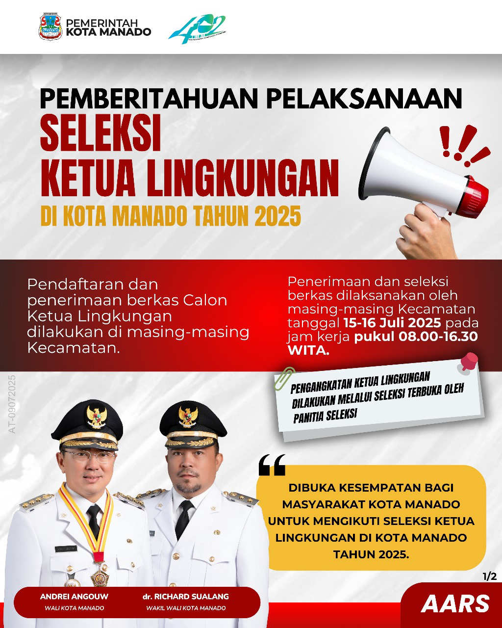 Pemerintah Kota Manado resmi membuka seleksi Calon Ketua Lingkungan (KetLing) secara terbuka dan transparan.