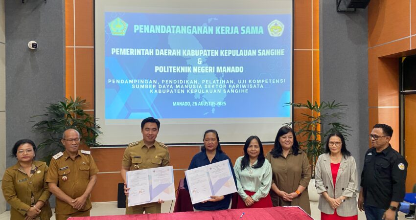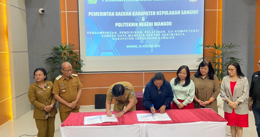 Ekuatornews.com – Sangihe. – Pemerintah Kabupaten (Pemkab) Kepulauan Sangihe terus mendorong sektor pariwisata sebagai salah satu penopang ekonomi daerah. Hal itu ditandai dengan penandatanganan Nota Kesepahaman (MoU) dan Perjanjian Kerja Sama (PKS) dengan Politeknik Negeri Manado, Selasa (26/8/2025), bertempat di kampus Politeknik Negeri Manado.