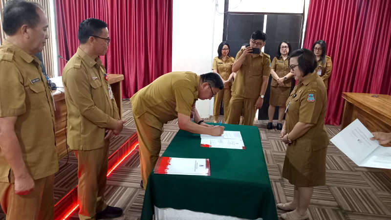 Pemkot Manado lewat Disdukcapil menggelar penandatanganan perjanjian kerja sama dengan Dinas Kesehatan serta tujuh puskesmas di Kota Manado, Selasa (30/2025).