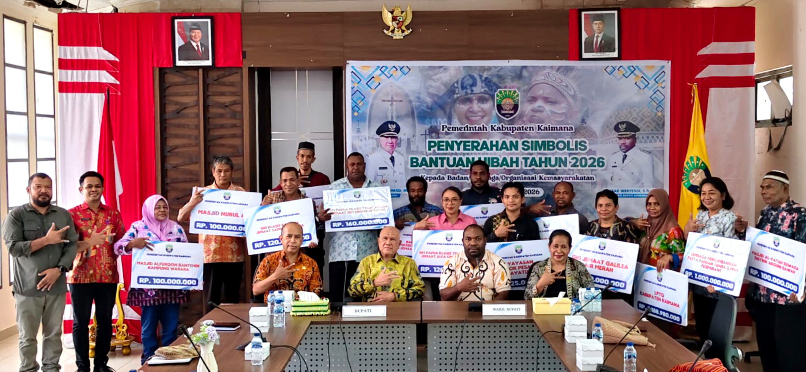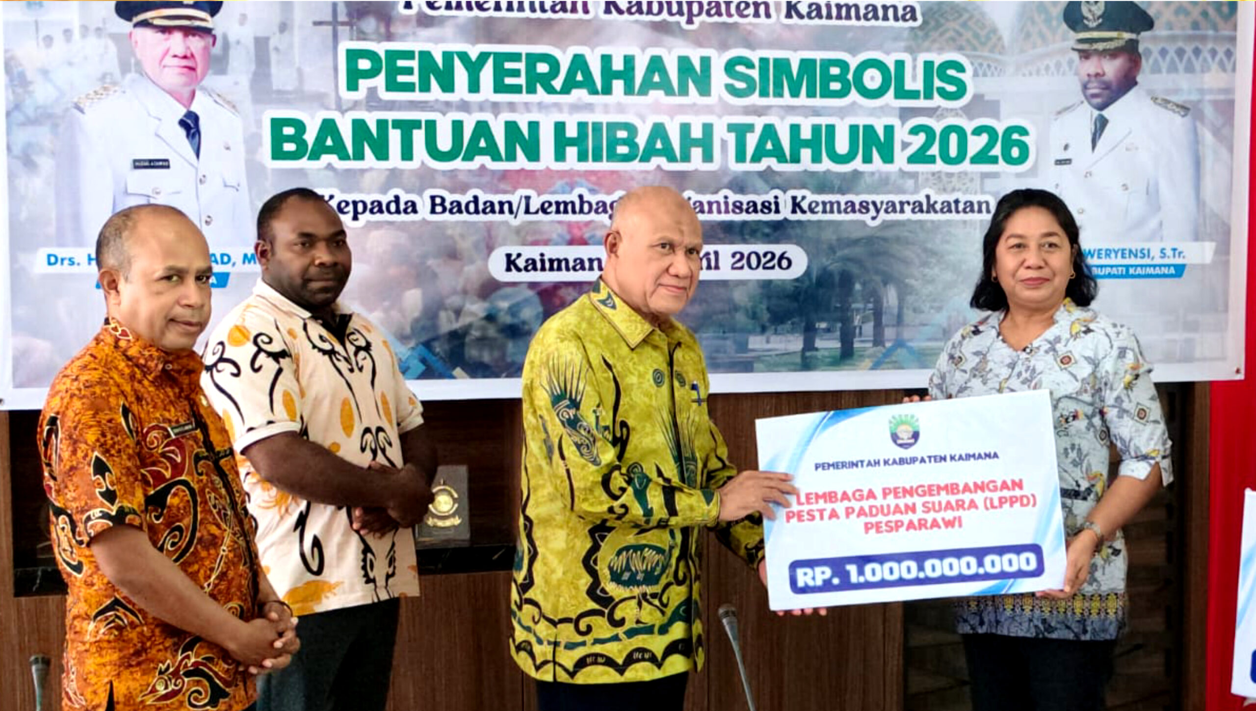KAIMANA, EkuatorNews.com – Pemerintah Daerah Kabupaten Kaimana menyerahkan bantuan dana hibah tahun 2026 secara simbolis di Aula Kantor Bupati, Kamis (9/4/2026).