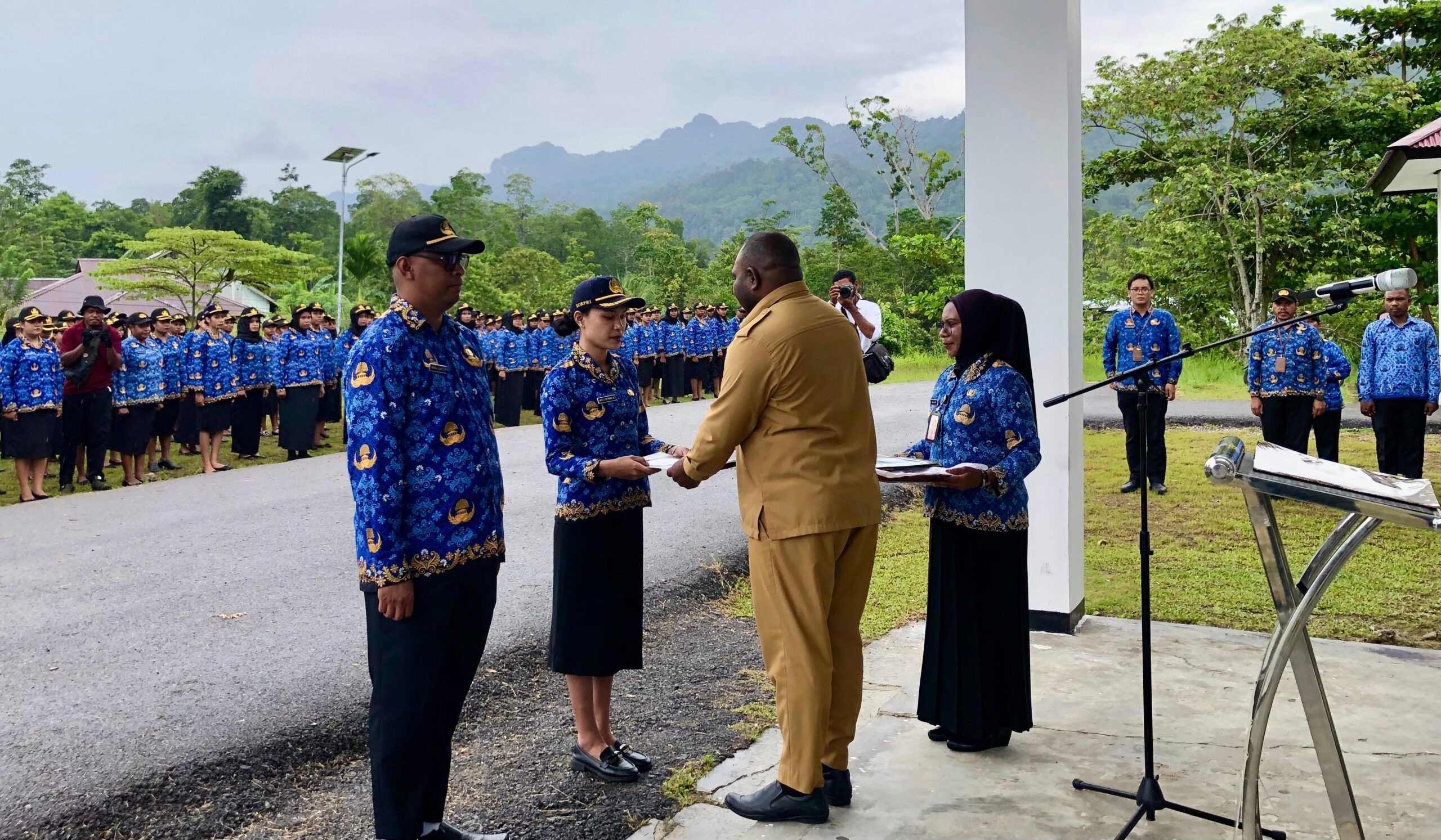 KAIMANA, EkuatorNews.com – Sebanyak 243 orang Calon Aparatur Sipil Negara (CASN) formasi tahun 2021 dan formasi tahun 2024 optimalisasi menerima Surat Keputusan (SK) tentang pengangkatan CASN dari Bupati Kabupaten Kaimana, di Halaman Kantor Badan Kepegawaian dan Pengembangan Sumber Daya Manusia (BKPSDM) Kaimana, Senin (20/4/2026).
