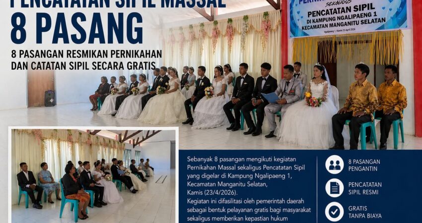 Ekuatornews.com. – Upaya pemerintah dalam memperkuat tertib administrasi kependudukan terus dilakukan. Dinas Kependudukan dan Pencatatan Sipil (Dukcapil) Kabupaten Kepulauan Sangihe kembali menggelar pelayanan pencatatan sipil massal di Kampung Ngalipaeng I, Kecamatan Manganitu Selatan Kamis (23/4/2026), dengan melibatkan 8 pasangan yang resmi mencatatkan perkawinannya.