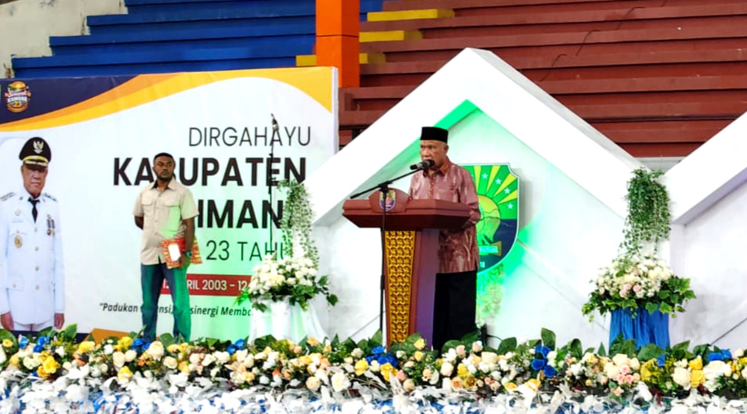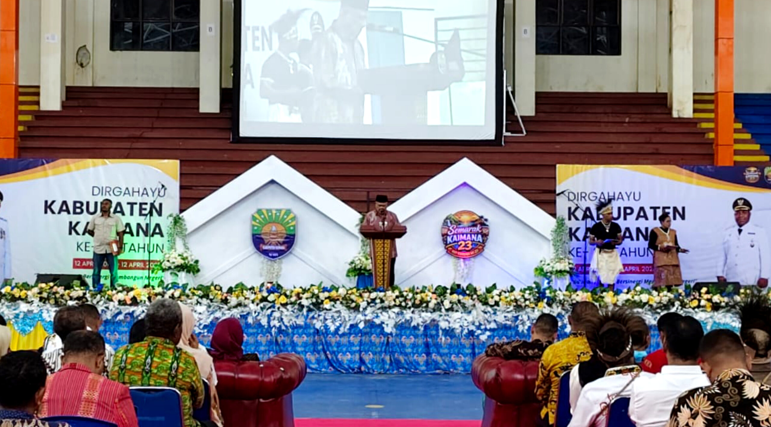 Dalam sambutannya, Bupati Kaimana, Drs. Hasan Achmad, M.Si, menyampaikan rasa syukur atas perjalanan Kabupaten Kaimana yang telah memasuki usia 23 tahun dengan berbagai pencapaian pembangunan.