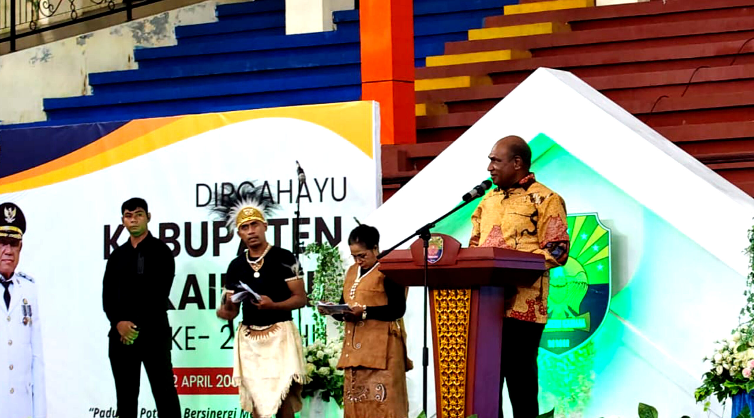 “Wakil Gubernur Papua Barat, Mohamad Lakotani, S.H., M.Si saat menyampaikan sambutan di perayaan puncak Hari Ulang Tahun (HUT) ke-23 Kabupaten Kaimana”